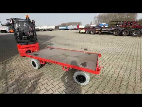 Disponible sur demandenice 2014 LINDE E12-01 electric forklift with duplex mast, side shift, built-in charger, 5,433 hours of operation + 2016 MAFI double-steered and connectable heavy-duty trailers (floor: 250x130cm) with a 6,000kg load capacity